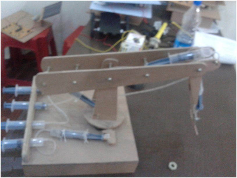- Components: The arm is constructed using wooden or similar materials, with multiple joints and segments. It is powered by several syringes connected via tubing, acting as hydraulic pistons.