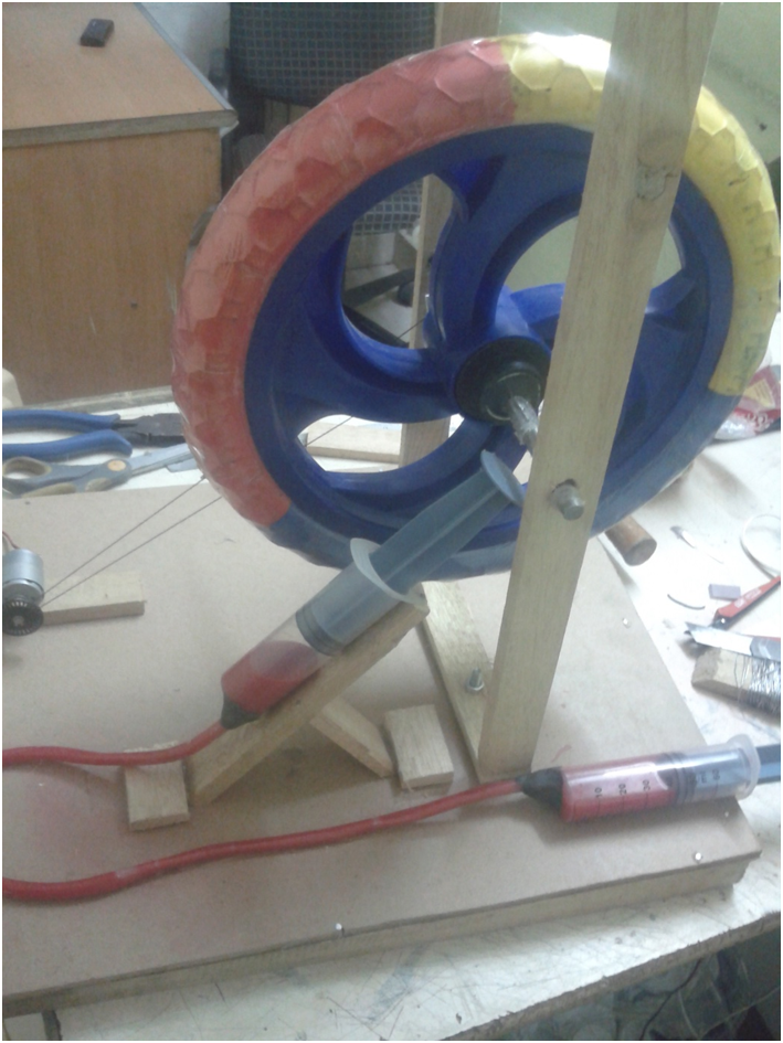 The wheel is mounted vertically on a sturdy wooden frame, its axle secured and allowing smooth rotation. Affixed to this axle is a syringe, a clever use of everyday items to create a hydraulic actuator. This syringe, connected by a red tube filled with fluid, is the key to this narrative.