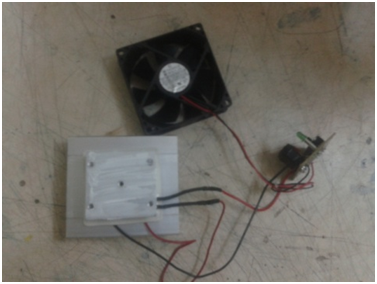 The main structure is housed in a simple wooden and particle board enclosure, and it includes electronic circuit boards which likely control the power and regulation of the cooling process. This type of refrigerator might be used for small-scale cooling needs and is a notable example of experimental or educational projects exploring alternative refrigeration technologies.