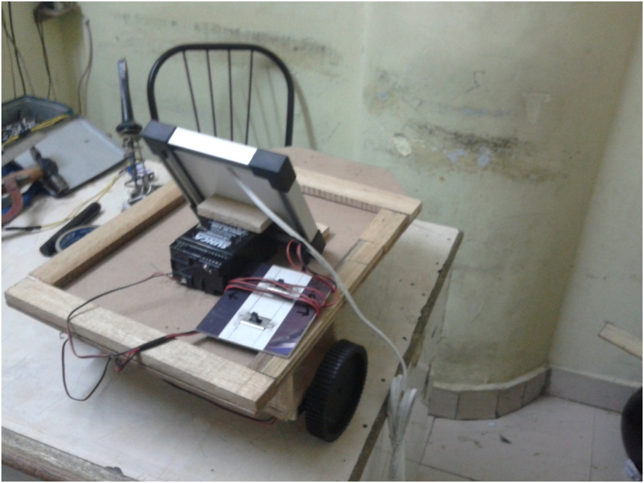 The image shows a simple solar-powered vehicle prototype. It appears to be a homemade solar car, constructed with basic materials. Key features of the model include: